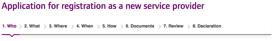 Your application to be a registered provider has to be submitted on the CQC Online portal. Your application will be made up of eight stages highlighted below: